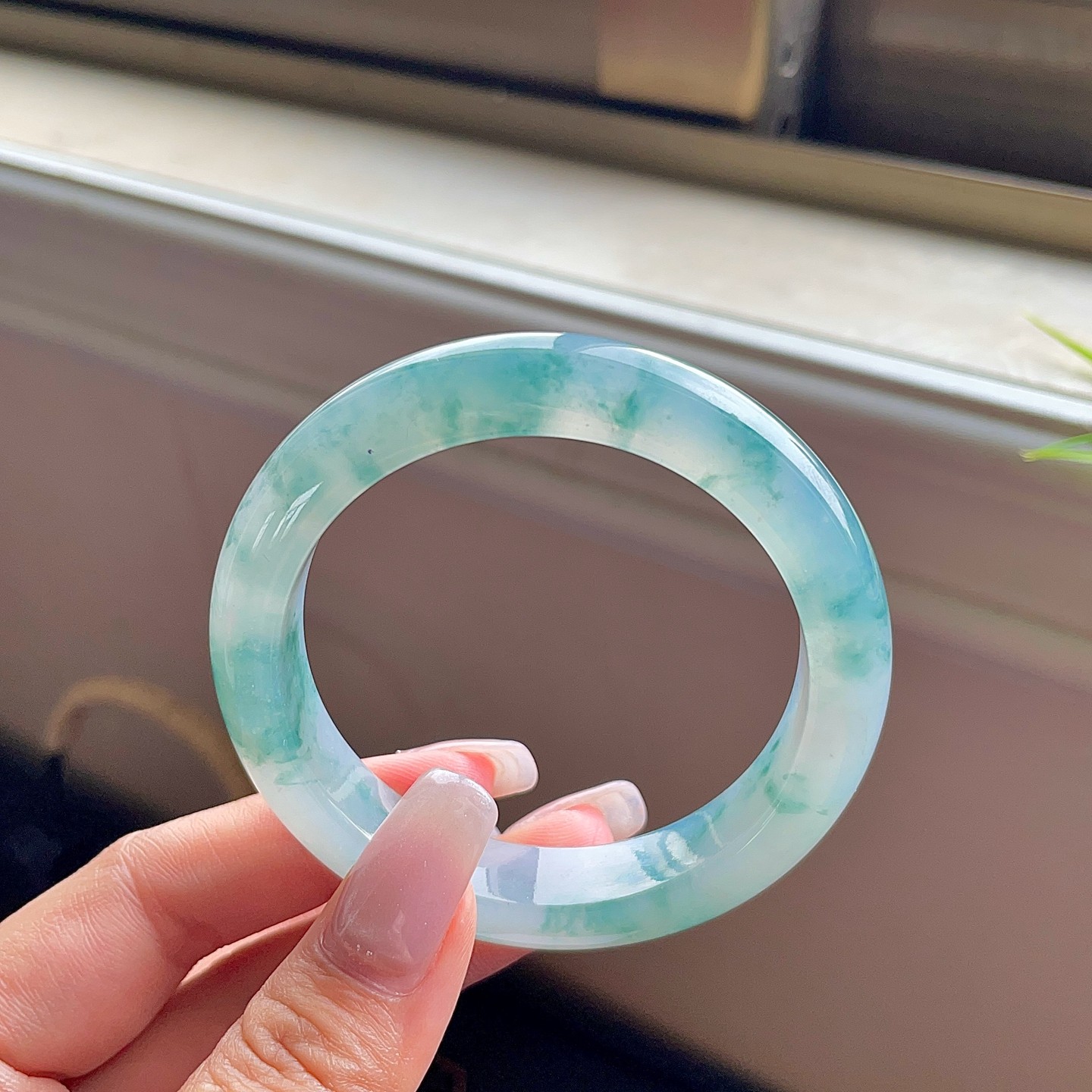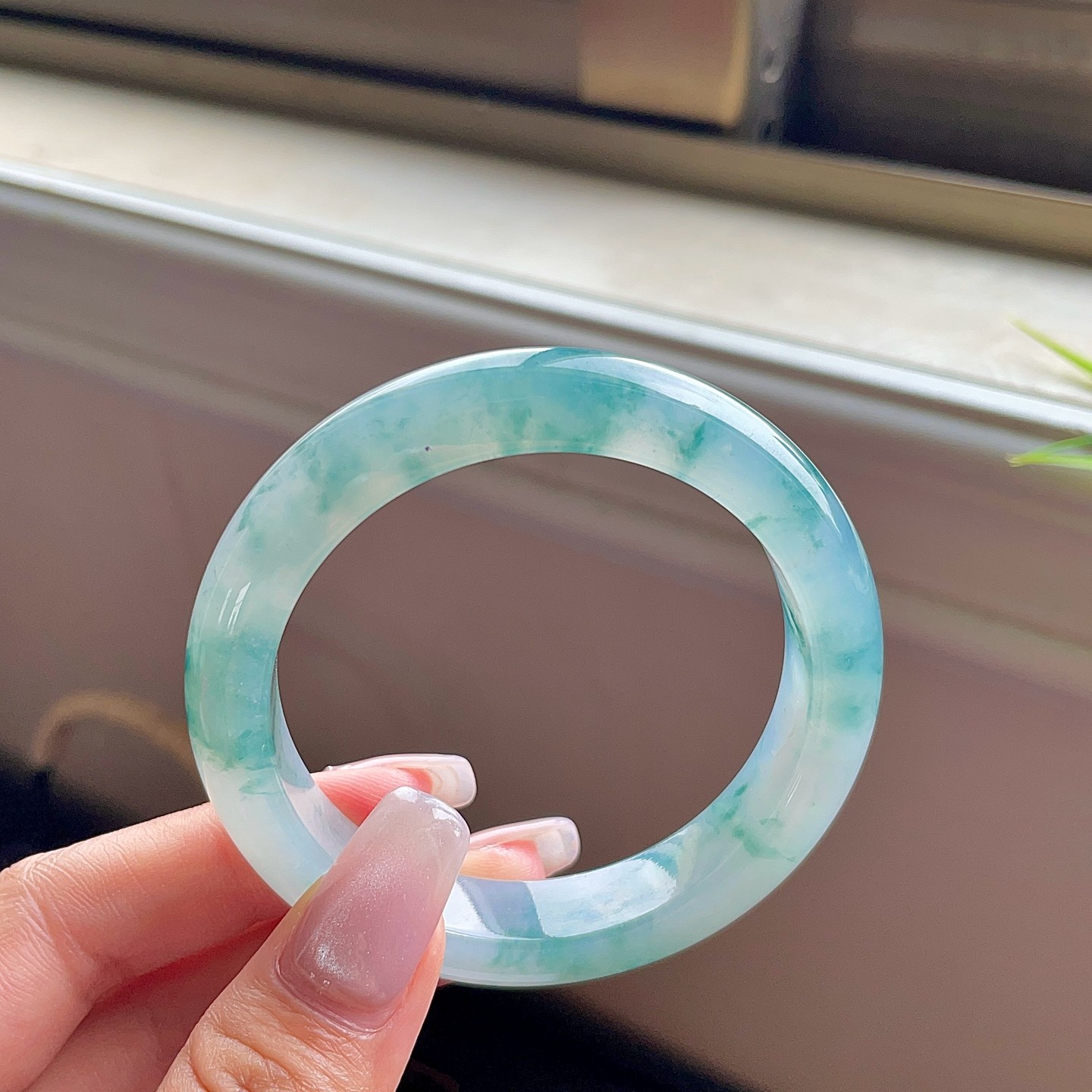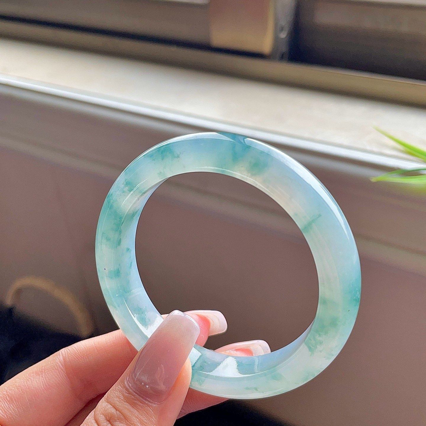 This natural jadeite bangle features an icy, jelly-like texture with natural fluorescence under light. It has a clean, translucent ice blue base with elegant floating flower patterns, and a well-proportioned, formal design—suitable for daily wear and collection.