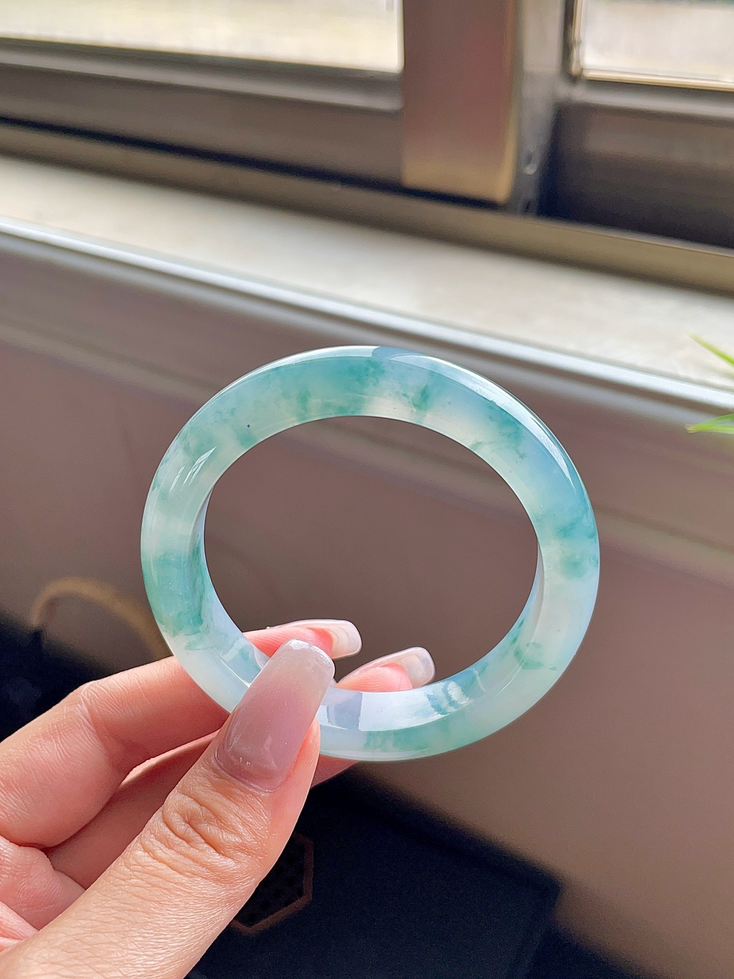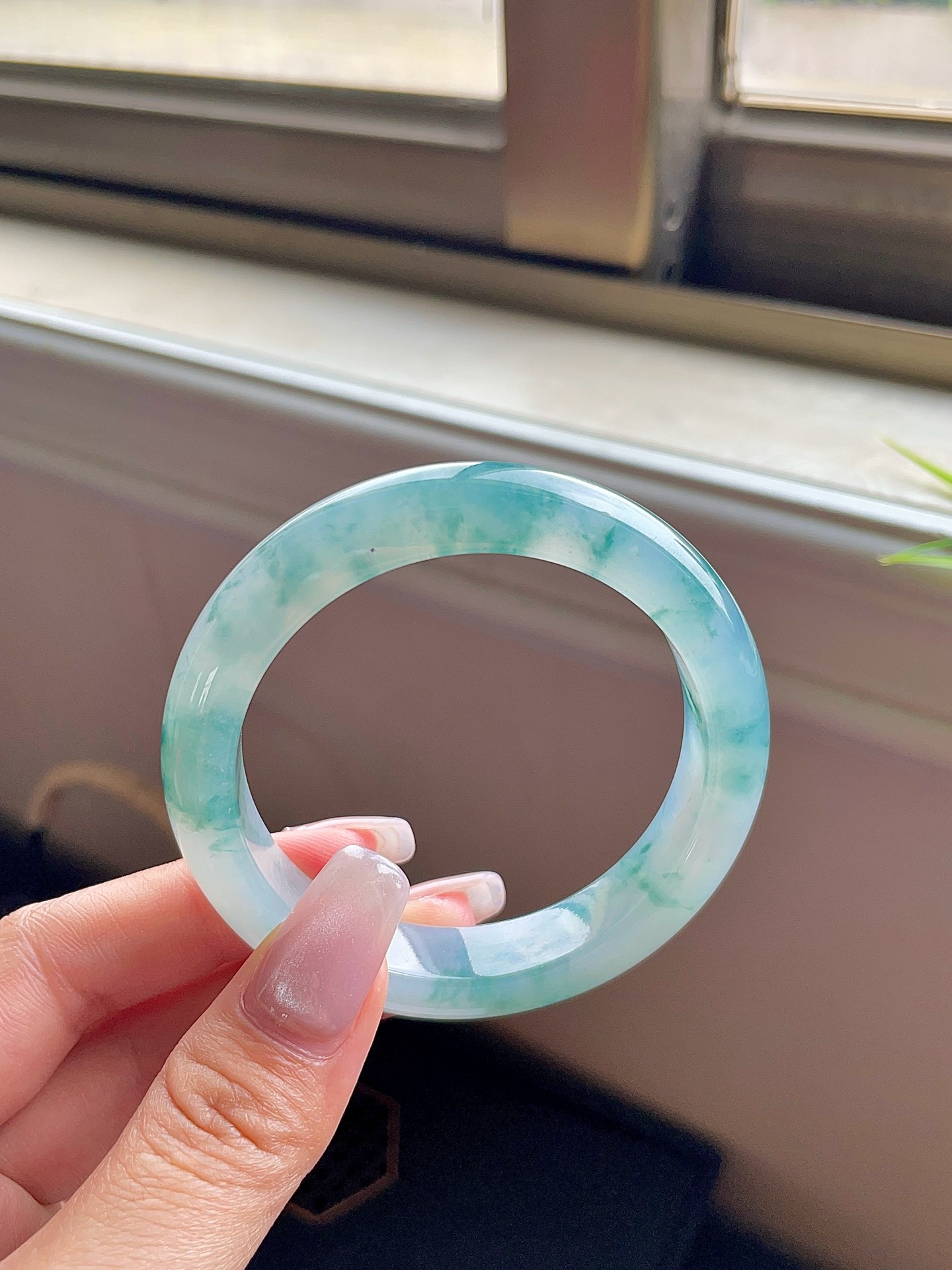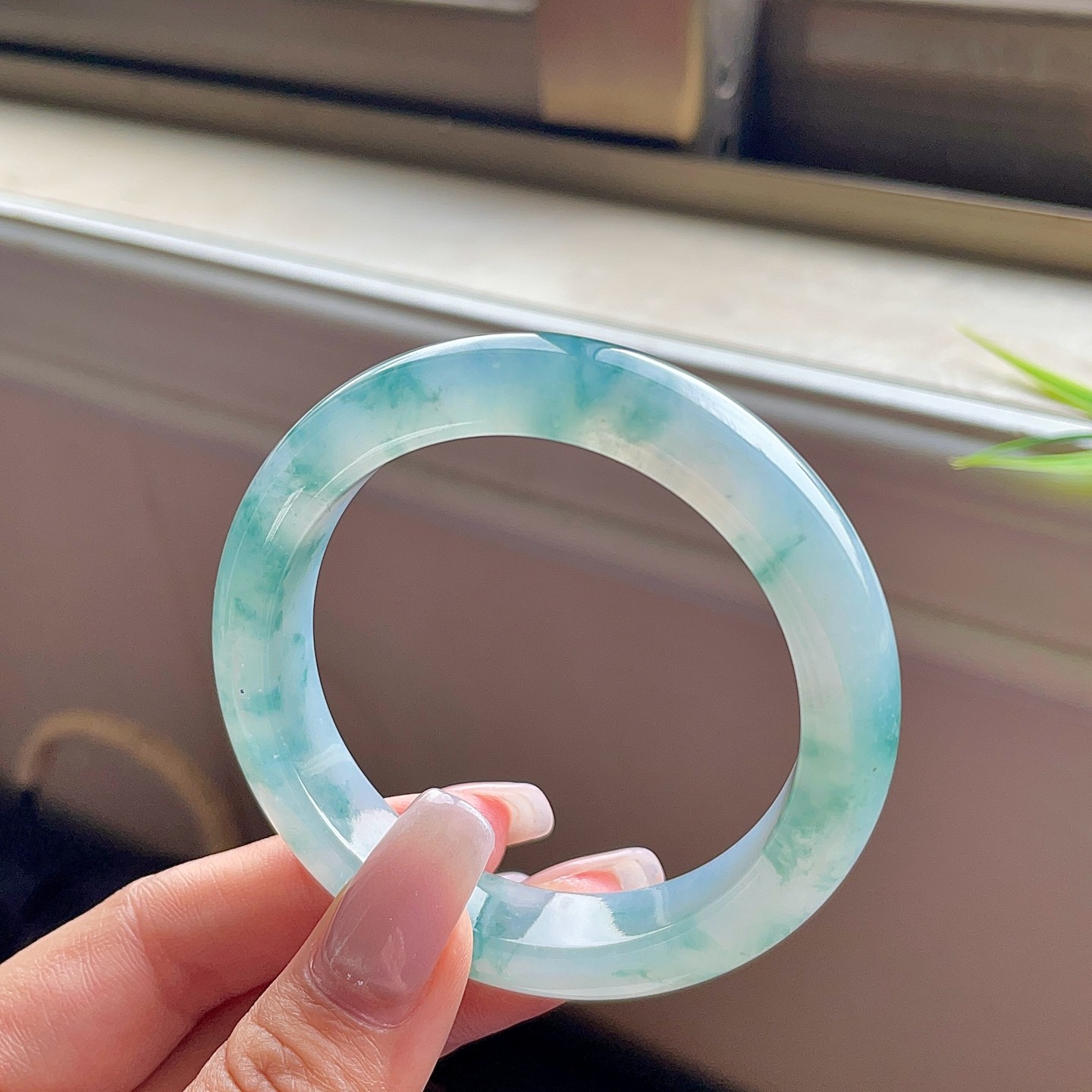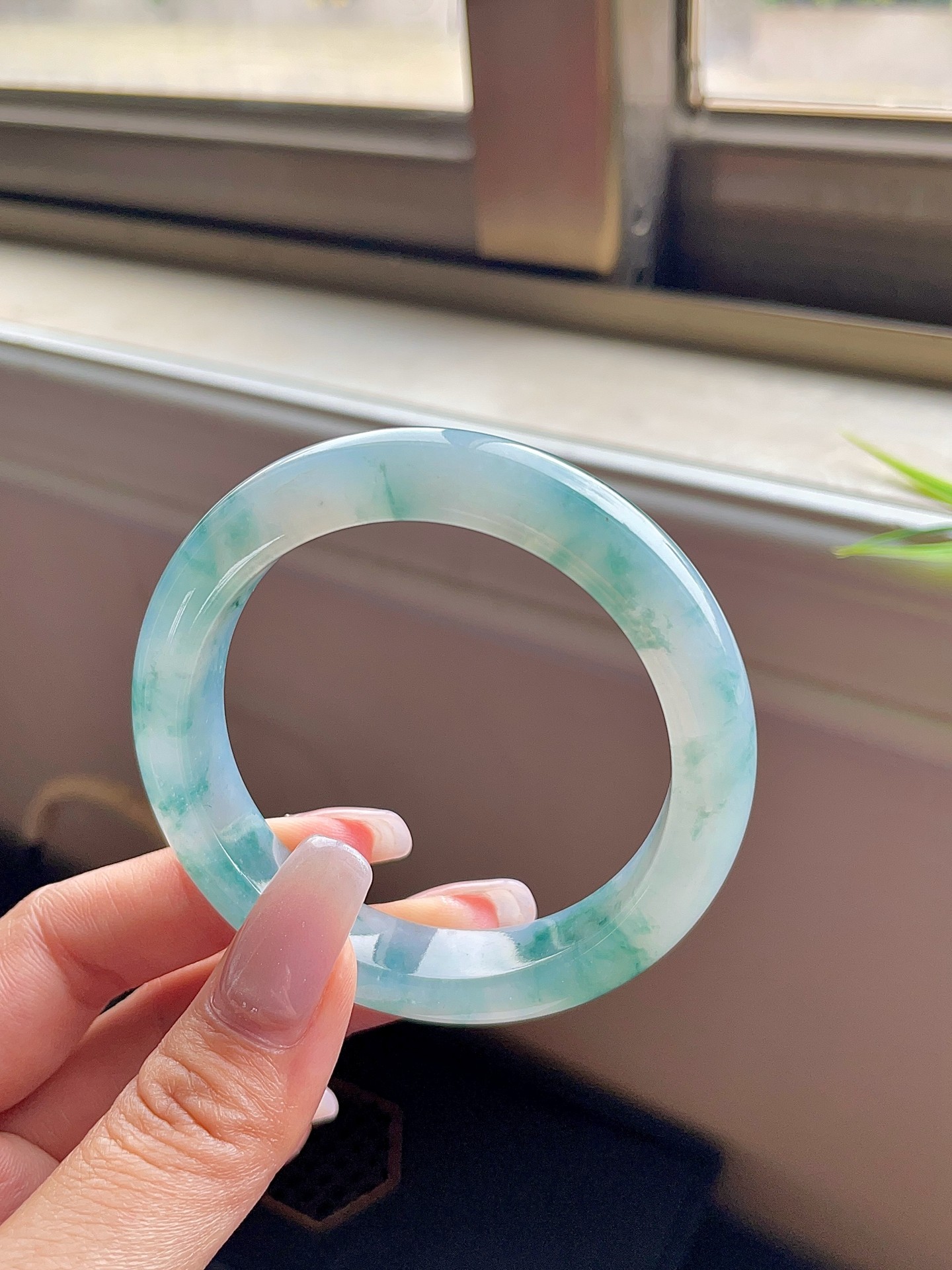 This natural jadeite bangle features an icy, jelly-like texture with natural fluorescence under light. It has a clean, translucent ice blue base with elegant floating flower patterns, and a well-proportioned, formal design—suitable for daily wear and collection.